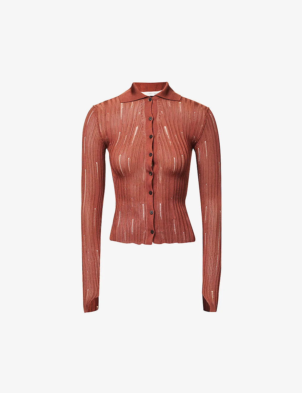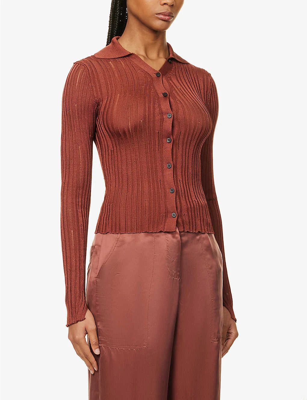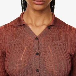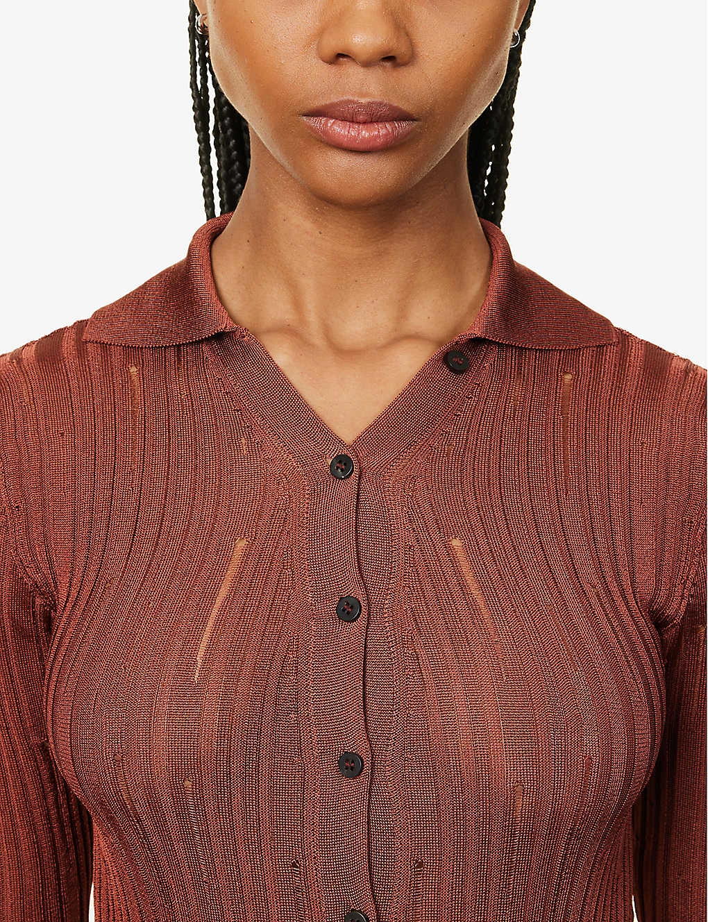 - Slim fit, collar, long sleeves, all-over distressed ribbed knit, contrast buttons, fine knit texture
