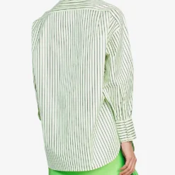 - Oversized fit, long sleeves, classic collar, all-over striped pattern, buttoned cuffs, curved hem