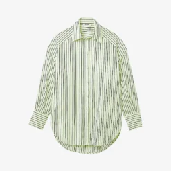 - Oversized fit, long sleeves, classic collar, all-over striped pattern, buttoned cuffs, curved hem