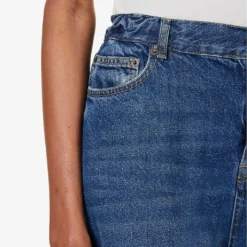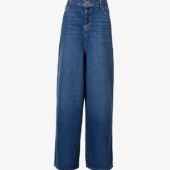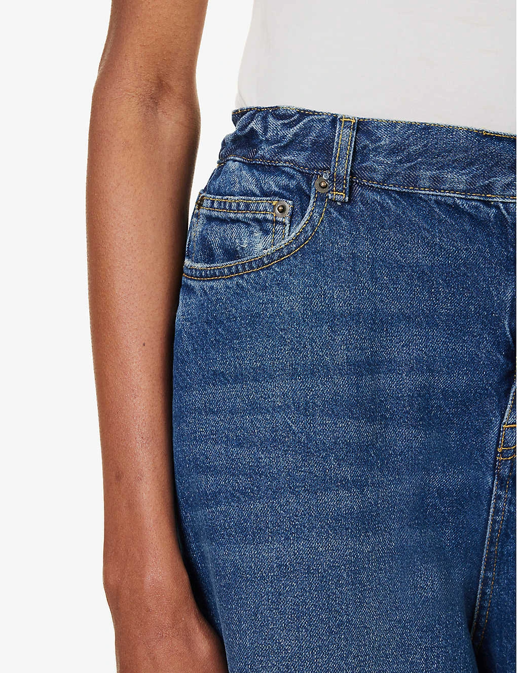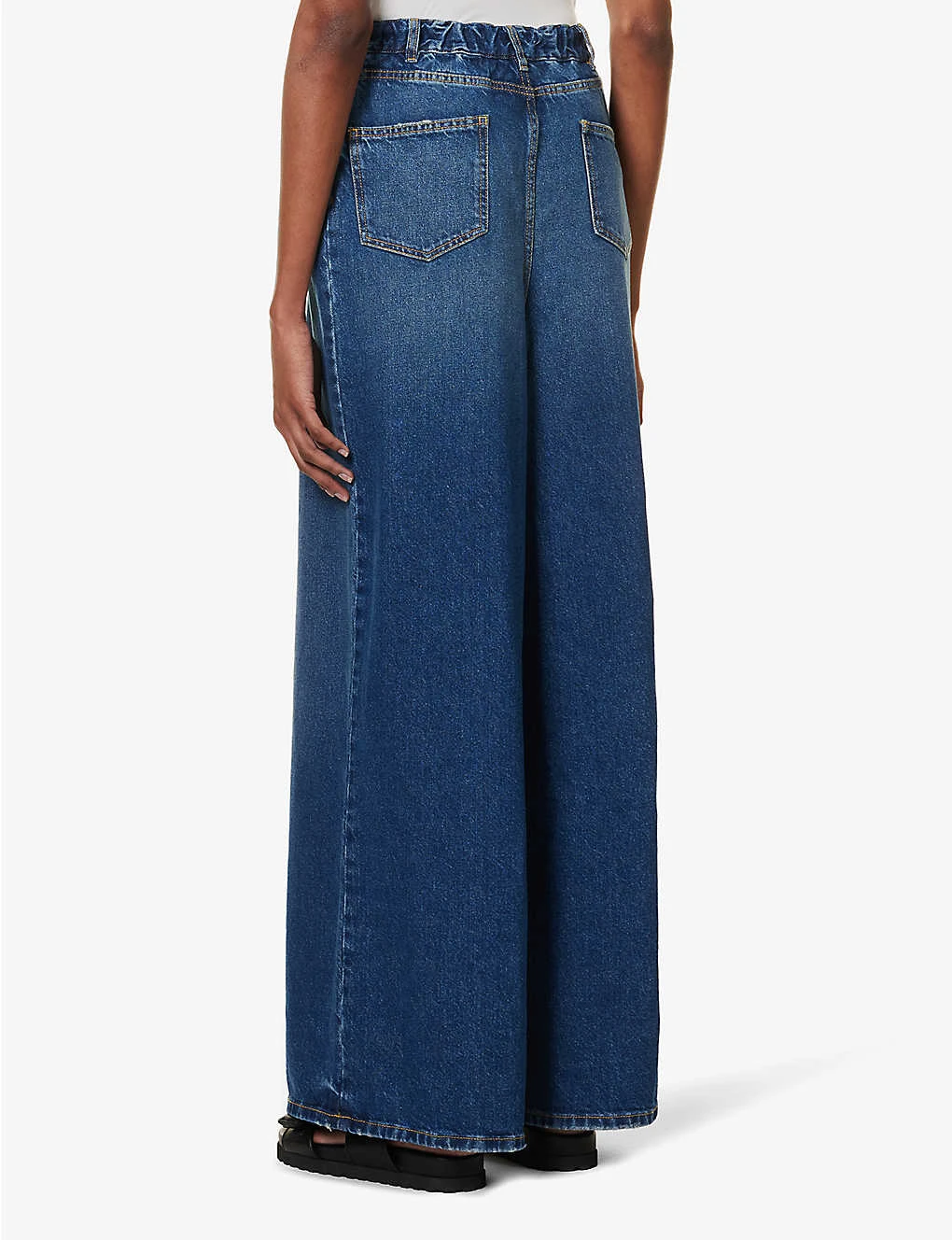 - Relaxed fit, mid-rise, wide leg, elasticated waistband with belt loops, five pockets, curved yoke at back, mid-wash, contrast stitching, gold-toned hardware
