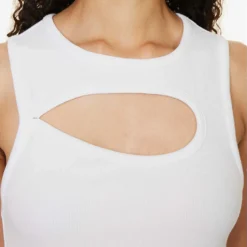 - Slim fit, round neck, sleeveless, dropped armholes, cut-out panel at front, ribbed texture