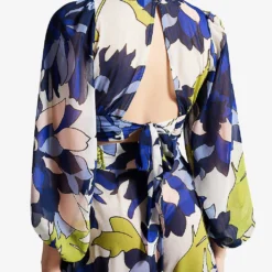 - Slim fit, long balloon sleeves, plunging V neck, cropped length, all-over graphic floral print, elasticated cuffs, back cut-out, tied back, button fastening at back