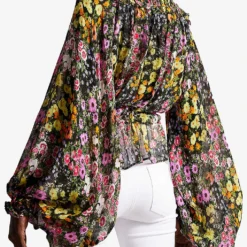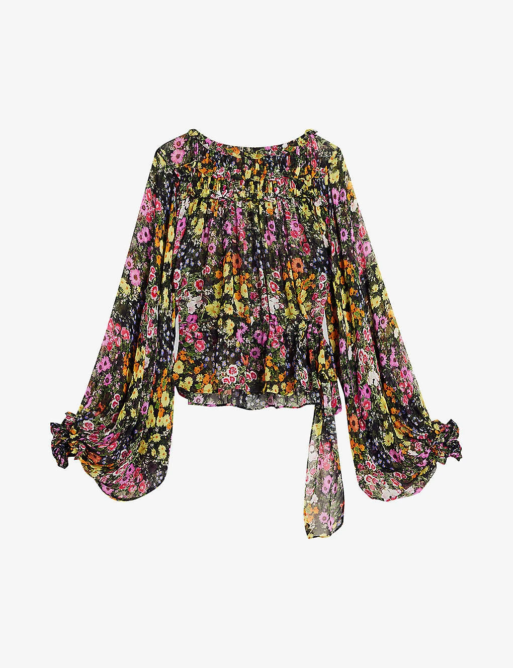 - Round neck, gathers and ruffles at neckline, oversized balloon sleeves, self-tie belt at waist, all-over floral-print