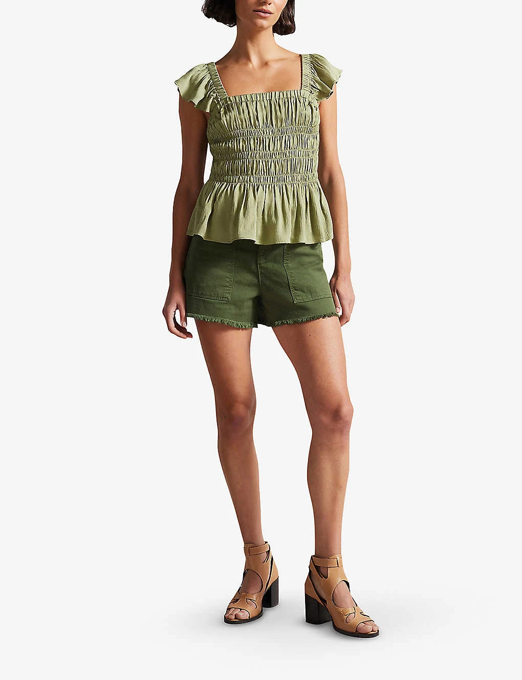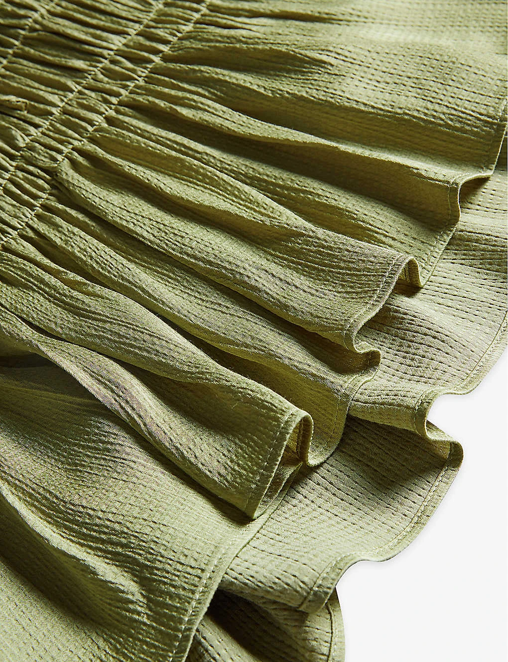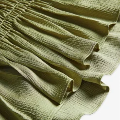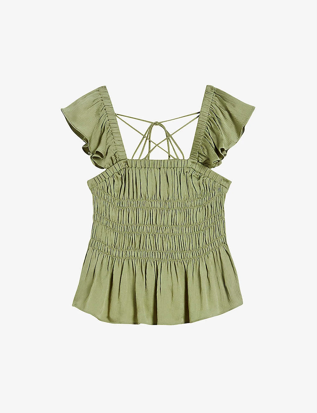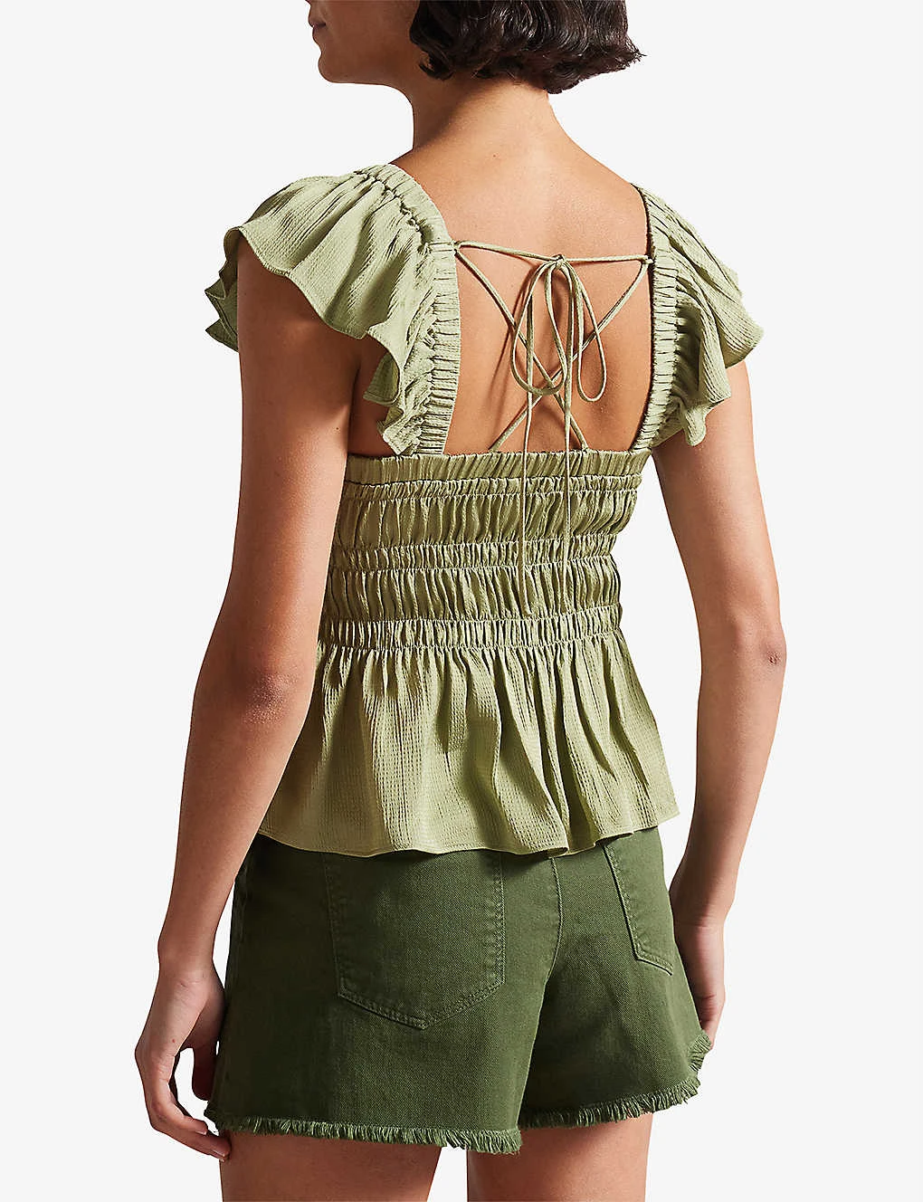 - Square neck, ruffled short sleeves, smocked bodice, lace-up back, ruffled hem