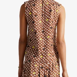 - Straight cut, sleeveless, round neck, all-over graphic geometric print, gathering at shoulders, button fastening at the back, keyhole at the back, straight hem