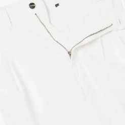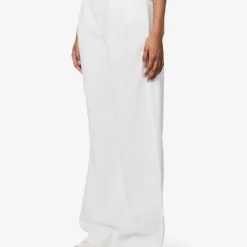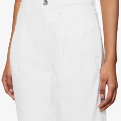 - Regular-fit, high-rise, wide leg, belt loops, two slip pockets at front, pleated panels at front, branded gold-toned hardware, all-over twill texture, V-shaped yoke at back, partially lined