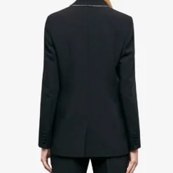 - Notch lapels, long sleeves, welt pocket at chest, flap pockets at front, rhinestone embellishment, single-vent at back