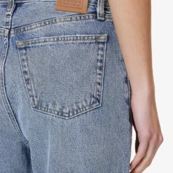 - Regular fit, mid-rise, straight leg, structured waistband with belt loops, five pockets, curved yoke at back, contrast stitching, brand patch at back, mid-faded wash, branded silver-toned hardware