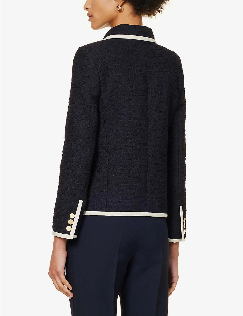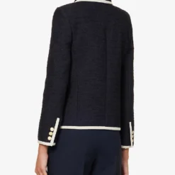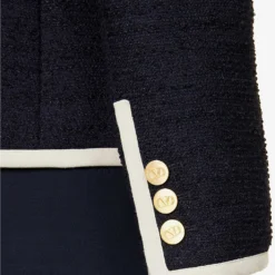 - Regular fit, collar, padded shoulders, long sleeves, three patch pockets at front, brand embroidery at chest, bouclé texture, branded gold-toned buttons, contrast trims, fully lined