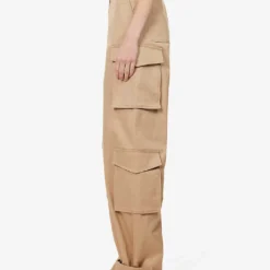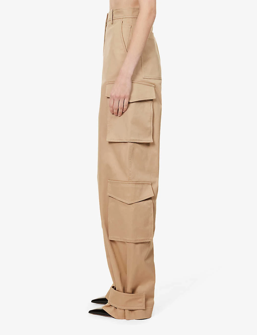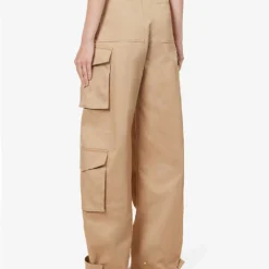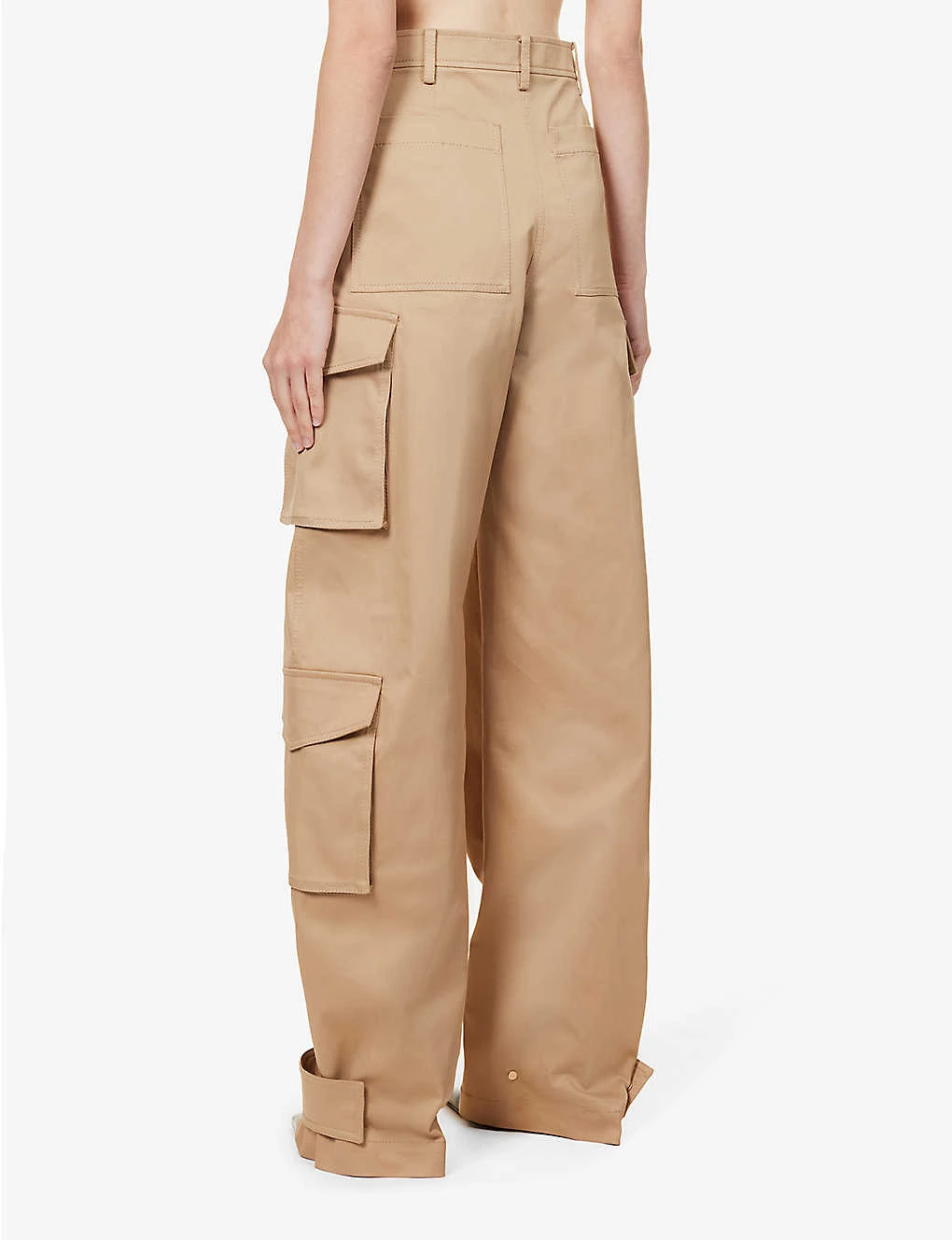 - Regular fit, high rise, straight leg, belt loops, two slip pockets at front, four flap pockets at sides, two patch pockets at back, adjustable cuffs, branded gold-toned hardware