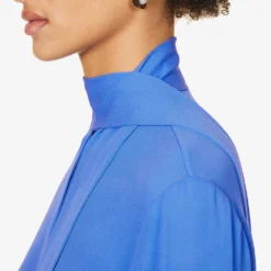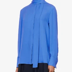 - Regular fit, self-tie at neck, long sleeves, buttoned sleeve hems, soft crepe texture, curved hem
