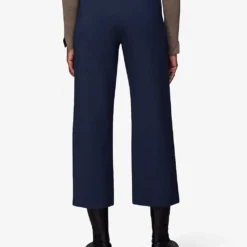 - Cropped length, wide leg, high fitted waist, front seams, fastening at side