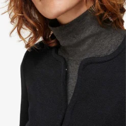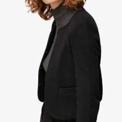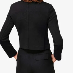 - Collarless, long sleeves, slim-fit, welt pockets at front, cropped