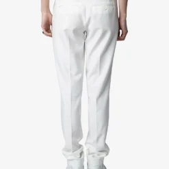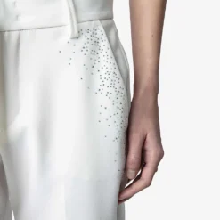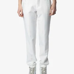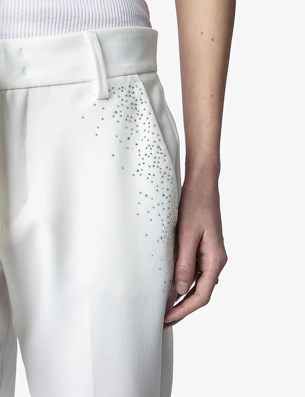 - Tapered leg, mid rise, belt loops, two slip pockets at sides, crystal-embellishment at pockets, pressed traveller’s crease at front